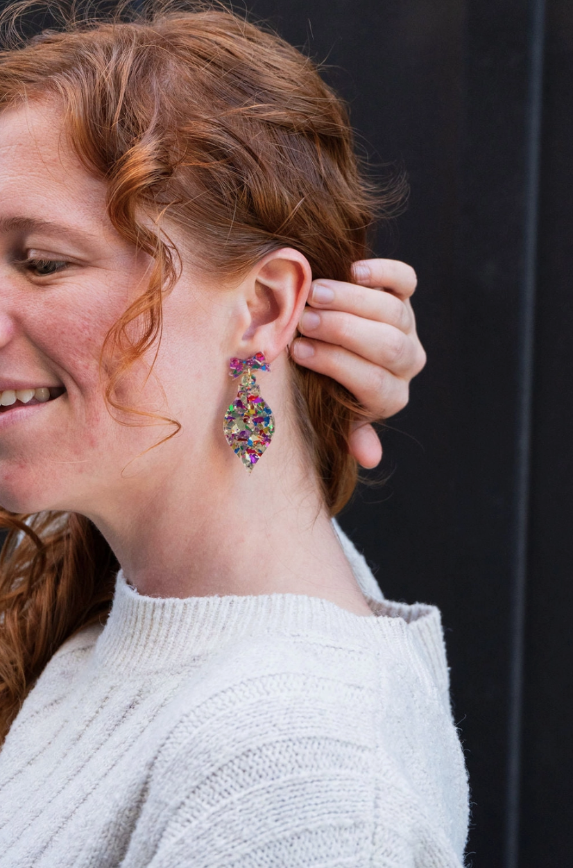 This holiday season, let your style be merry and bright with these sparkly confetti Christmas Ornament Earrings. Add a touch of sparkle to your festivities and embrace the joy of the season! The Christmas Ornaments come in three different colors and vintage-inspired shapes, adorned with a bow on top!